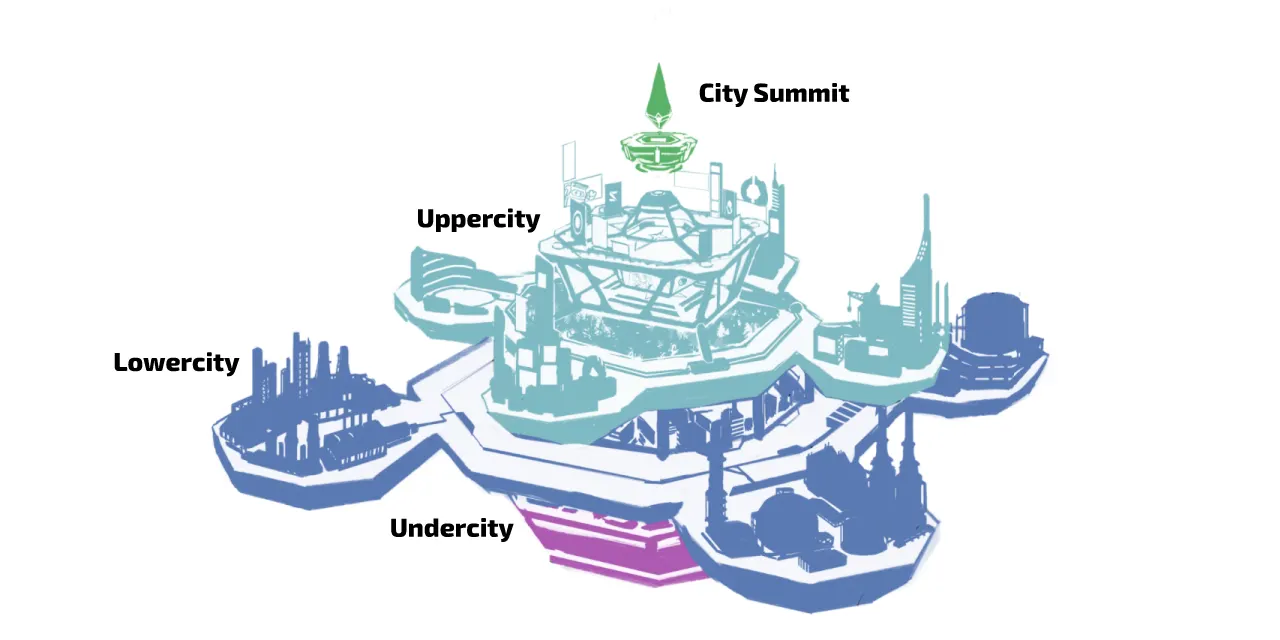 Synop City, which is also the venue of SMASH LEGENDS, serves as both the administrative and commercial hub of the Library World and is divided into four levels.
