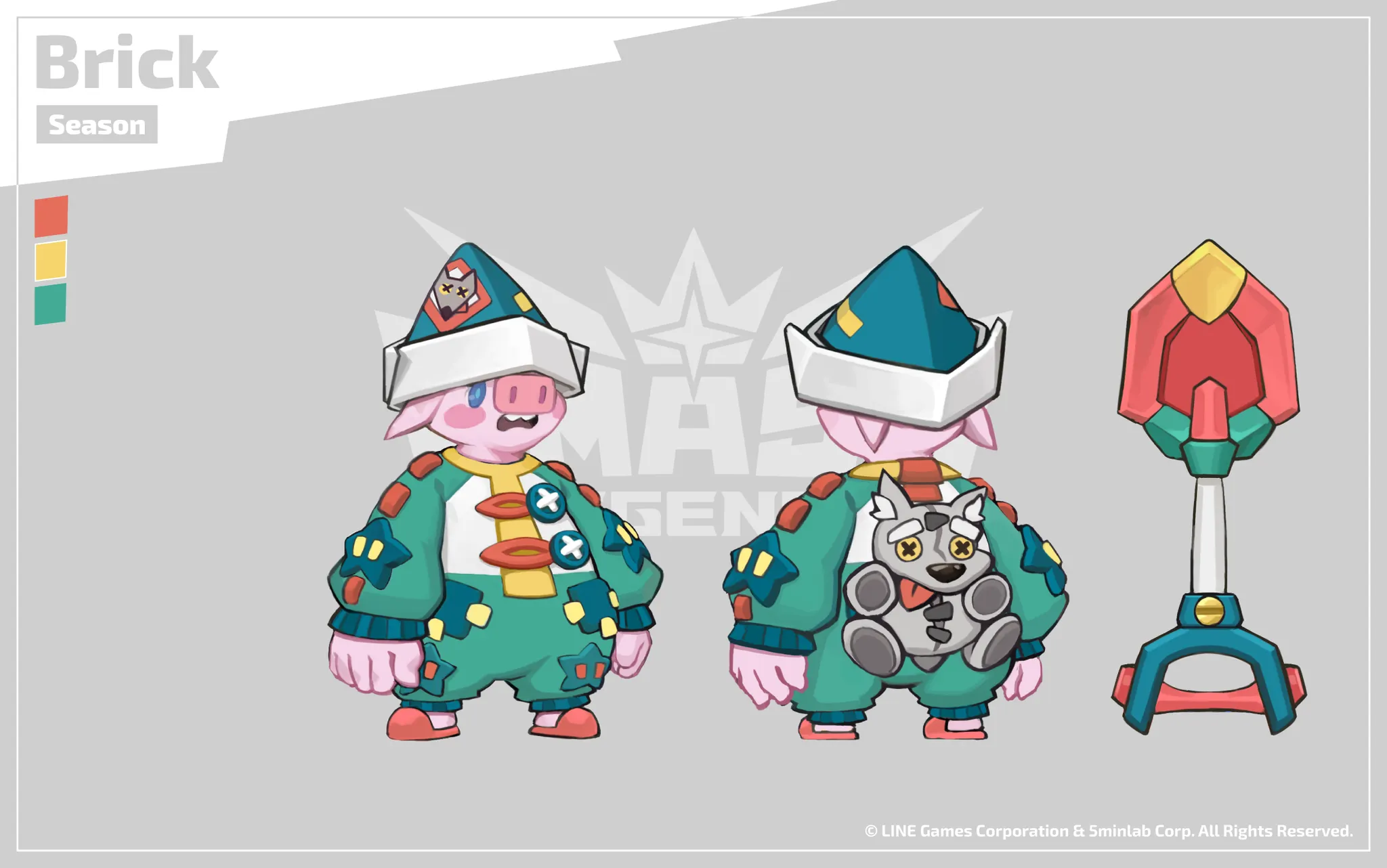 [돼지 홀로 집에] 시즌을 위해 만들어진 특별한 복장. 매년 이맘때가 되면, 브릭은 집에 혼자 꽁꽁 틀어박혀 인형놀이를 즐기곤 했다. 스매시 레전드에 참가하며 어쩔 수 없이 집 밖으로 나서게 된 브릭의 적응을 돕기 위해, 주최측에서는 특별히 맞춤 제작한 실내외 착용 가능한 잠옷을 브릭에게 선물해주었다.
